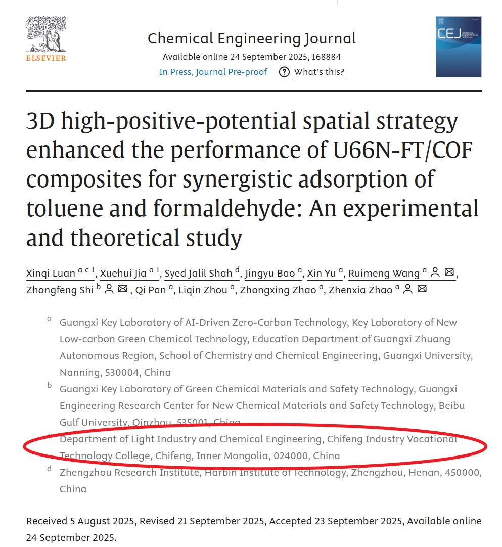 近日,我院轻工化工系栾昕奇博士在化工材料领域SCI期刊《Chemical Engineering Journal》发表题为“3D high-positive-potential spatial strategy enhanced the performance of U66N-FT/COF composites for synergistic adsorption of toluene and formaldehyde: An Experimental and theoretical study”的研究论文。《Chemical Engineering Journal》期刊为中科院、JCR双一区Top期刊,2024年影响因子13.2。栾昕奇博士为该论文的第一作者,赤峰工业职业技术学院为第三完成单位。