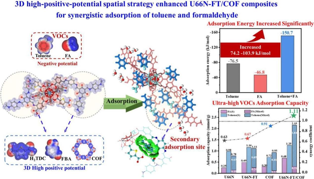 该研究成果针对多组分VOCs(挥发性有机化合物)吸附过程中竞争效应导致的吸附效率降低问题,创新性地提出在U66N框架中同时引入高正电势配体单元和COF共价单元,成功构建了具有三维高正电势的U66N-FT/COF复合材料。实验结果表明,U66N-FT/COF复合材料对混合组分VOCs中甲苯和甲醛的工作吸附容量分别达1.84和0.31mmol/g,较原始U66N提升192.1%和106.7%,协同吸附系数从0.63提升至1.11,显著提升了高湿环境下MOFs对混合组分VOCs的协同吸附性能。
